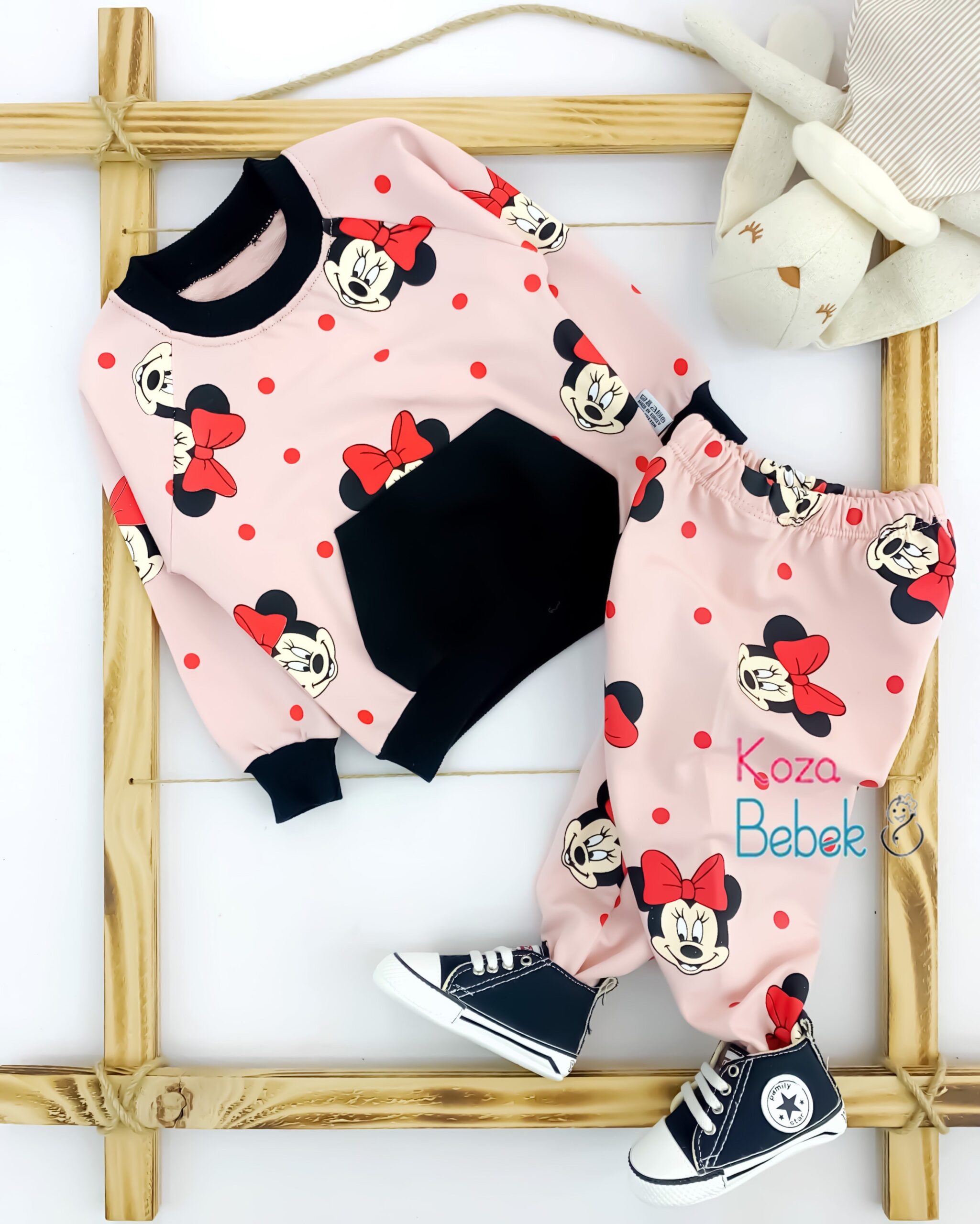 Śliczny dziewczęcy dres 2-częściowy w kolorze różowym. Bluza wykończona jest czarnym ściągaczem na dole i przy rękawkach. Lamówka wokół szyi również jest czarna. Bluza ma klasyczny krój i wkładana jest przez głowę. Oryginalności dodaje jej kieszonka kangurka w kolorze czarnym. Spodnie posiadają czarne ściągacze przy nogawkach i pas w gumkę.. Uroku całemu kompletowi nadają nadruki Myszki Minnie na bluzie i na spodniach. To model uszyty z przyjemnej, miękkiej dzianiny, nie krępującej ruchów dziecka.