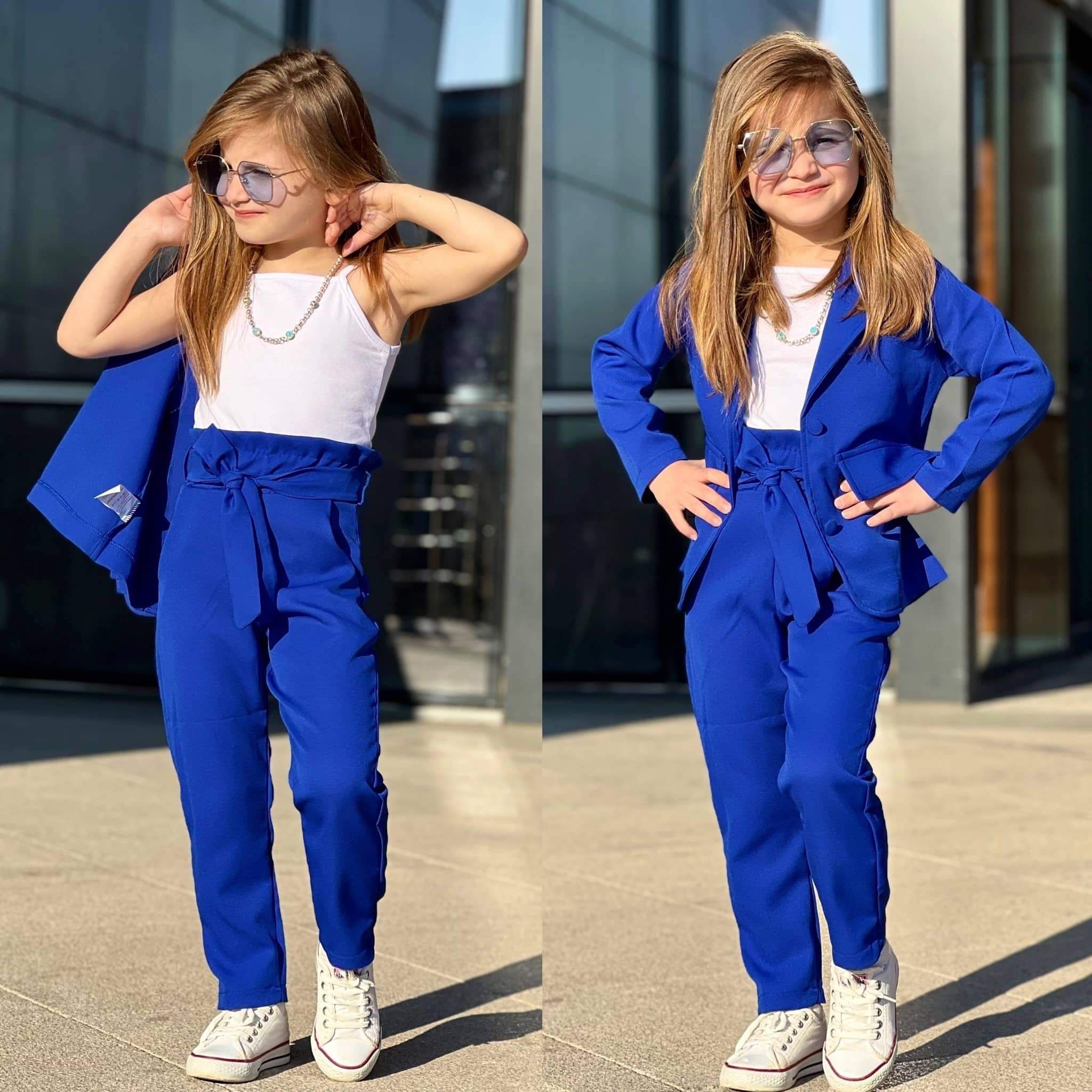 Niesamowicie elegancki i jednocześnie wygodny komplet dziewczęcy, w skład którego wchodzą bluzka na ramiączka, marynarka i spodnie. Bluzka ma cienkie ramiączka i klasyczny kolor biały, który pięknie kontrastuje z granatowym garniturem. Marynarka ma prześliczny, głęboki kolor kobaltowy. Zapinana jest na dwa guziki, posiada miękki kołnierzyk, oraz imitację dwóch kieszeni. Spodnie z wysokim stanem, wyjątkowe w swojej prostocie. Na ich przodzie znajdują się dwie praktyczne kieszonki po bokach. W pasie ubranka umieszczony jest elastyczny ozdobnie marszczony ściągacz, który podtrzymuje je we właściwym miejscu oraz szlufki, przez które można przełożyć ozdobny pasek. Cały komplet tworzy ponadczasowy i elegancki garnitur dziewczęcy, który bedzie idealną stylizacją na uroczyste okazje.
