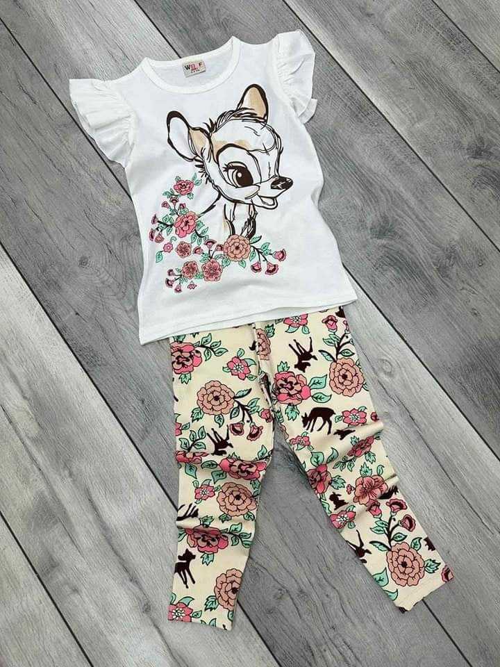 Efektowny dziewczęcy komplet: t-shirt+legginsy dla fanek bajki Bambi. Biała bluzka z krótkim rękawem ma klasyczny krój z okrągłym dekoltem. Oryginalności dodaje jej nadruk z głównym bohaterem. Falbanki przy ramionach dodają lekkości i podkreślają dziewczęcy styl. Legginsy a'la prążek idealnie komponują się z bluzką i posiadają praktyczną gumkę w pasie. To model uszyty z przyjemnej, miękkiej bawełny, nie krępującej ruchów dziecka.