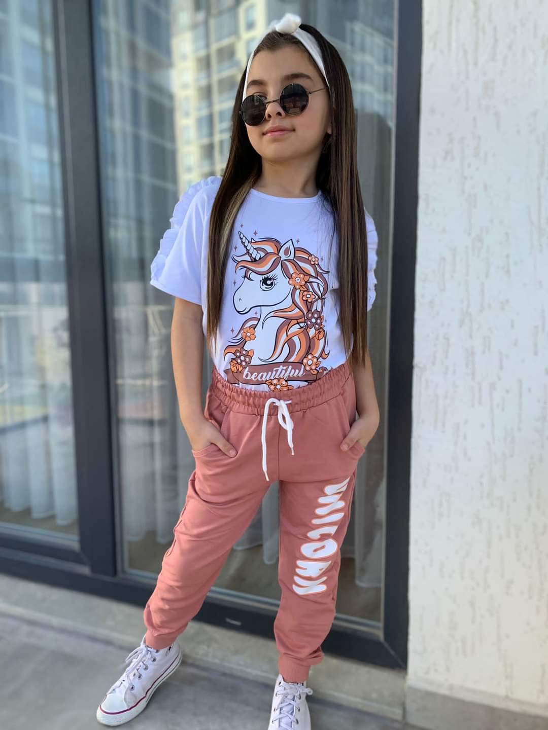 Efektowny dziewczęcy komplet: t-shirt i spodnie. W zestawie biała bluzka na krótki rękaw z nadrukiem jednorożca. Brązowe spodnie z napisem UNICORN posiadają dwie praktyczne kieszenie z przodu i nogawki ze ściągaczami. Szeroki pas w gumkę z dodatkową regulacją-sznureczkami. To model uszyty z przyjemnej, miękkiej dzianiny dresowej, nie krępującej ruchów dziecka.