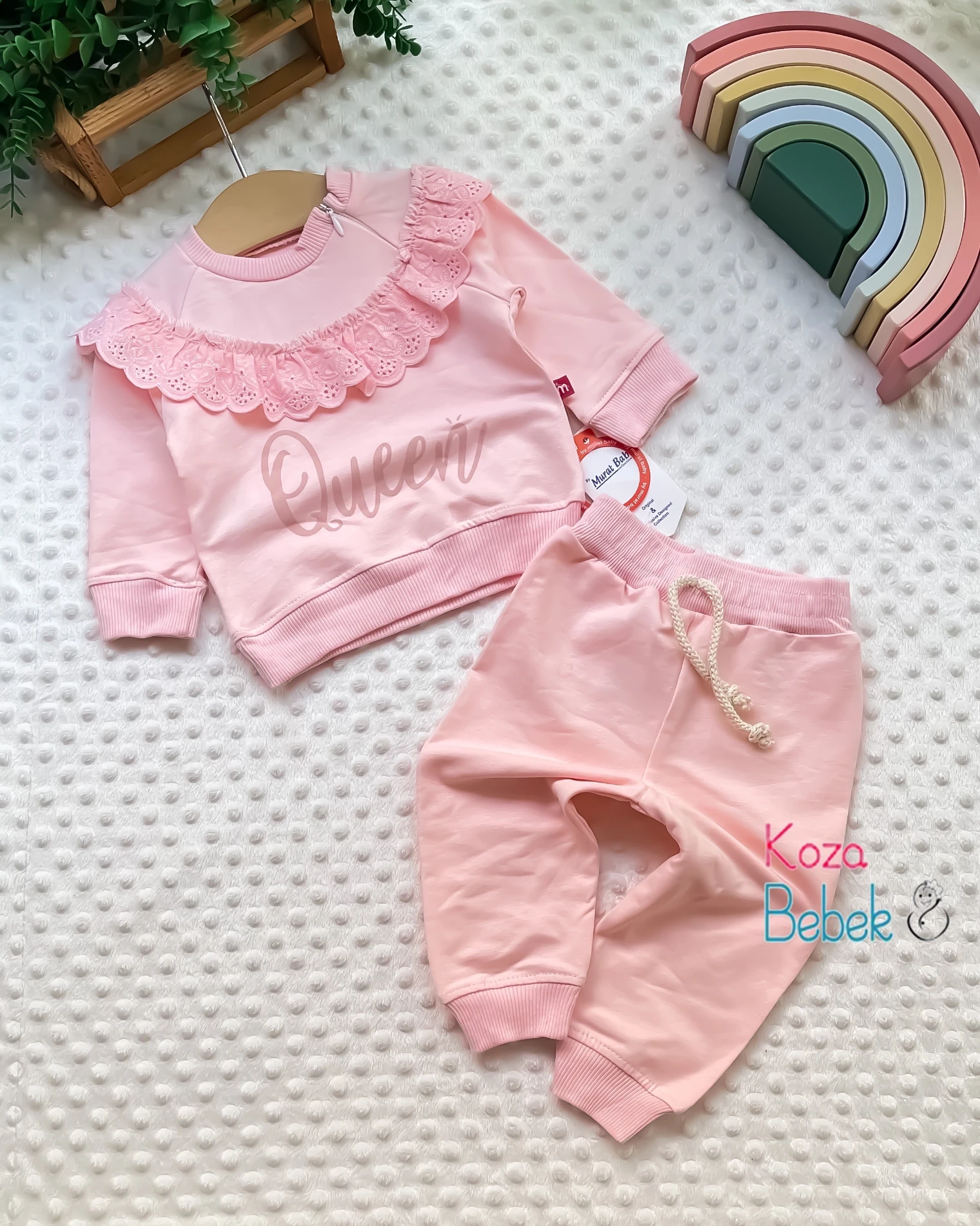 Bawełniany komplet 2-częściowy w kolorze brzoskwiniowym. Prześliczna bluza wciągana jest przez głowę i zapinana na ekspres przy szyjce. Ubranko na przodzie posiada ozdobne zdobienie z gipiury, które dodaje lekkości i podkreślają dziewczęcy styl. Uroku bluzeczce dodaje nadruk z napisem Queen. Spodnie posiadają ściągacze przy nogawkach i pas w gumkę, aby spodenki utrzymywały się na swoim miejscu. To model uszyty z przyjemnej bawełny, nie krępującej ruchów dziecka.