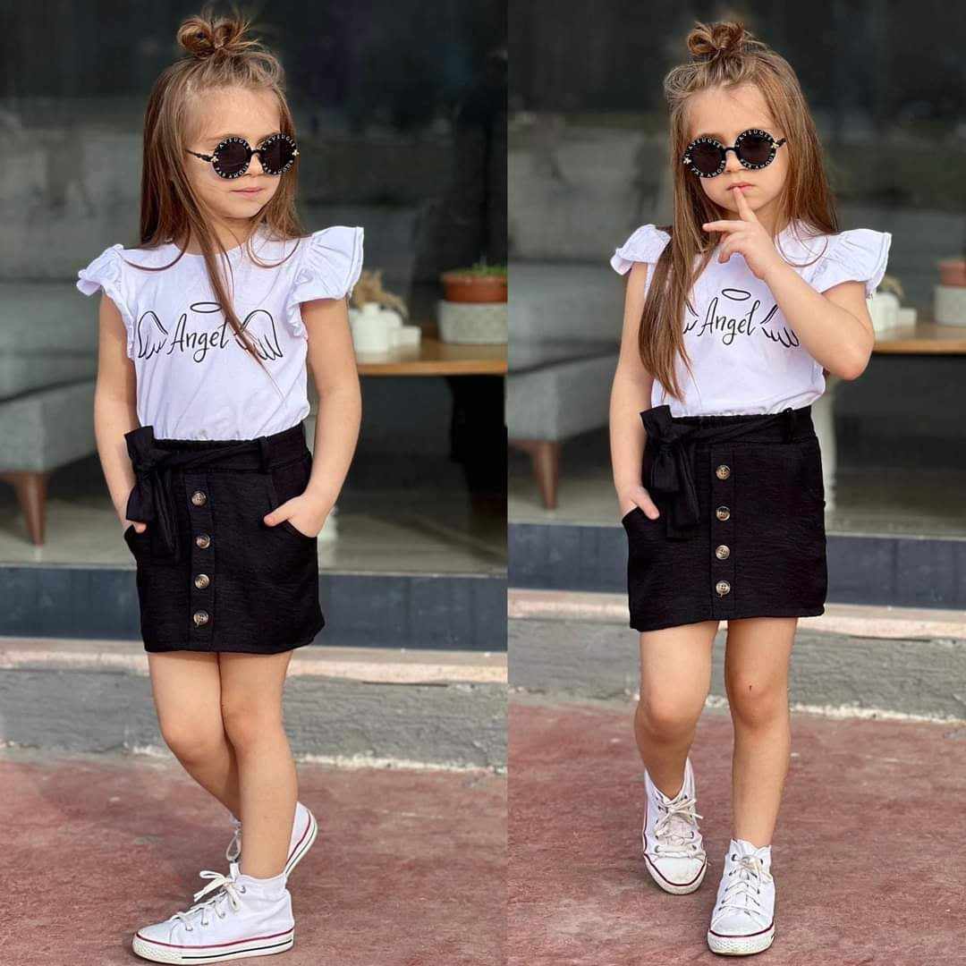 Piękny dziewczęcy komplet dla małej damy. Biała bluzka z nadrukiem skrzydełek i napisem Angel. Jest to klasyczny model z okrągłym dekoltem. Falbanki przy ramionkach dodają lekkości i dziewczęcego stylu. Idealne połączenie kolorystyczne do bluzki stanowi czarna spódniczka muślinowa. Spódniczka ma dwie kieszenie oraz ozobne guziki. W pasie umieszczony jest elastyczny ozdobnie marszczony ściągacz, który podtrzymuje ją we właściwym miejscu oraz szlufki, przez które można przełożyć ozdobny pasek. Ten zestaw doskonale łączy styl, wygodę i doskonałą jakość. Idealna stylizacja na wiosenne dni.