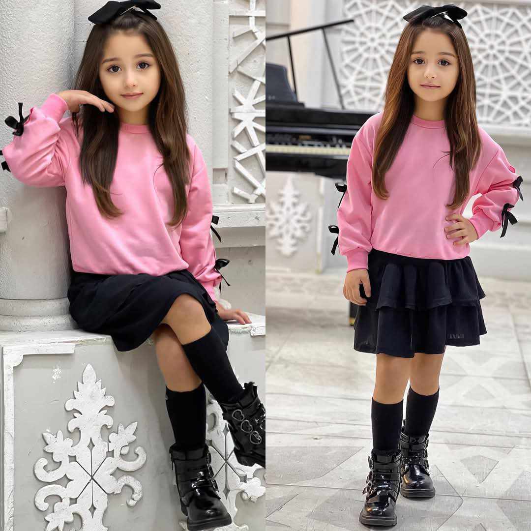 Efektowny dziewczęcy komplet na czadowe stylówki i wyróżnienie z tłumu. W zestawie bluza w kolorze różowym. Zakończenia kokardkami przy rękawkach dodają lekkości i podkreślają dziewczęcy styl. Prześliczna czarna spódniczka posiada gumę w pasie, aby spódniczka utrzymywałą się na swoim miejscu. Ten komplet spodoba się każdej dziewczynce!