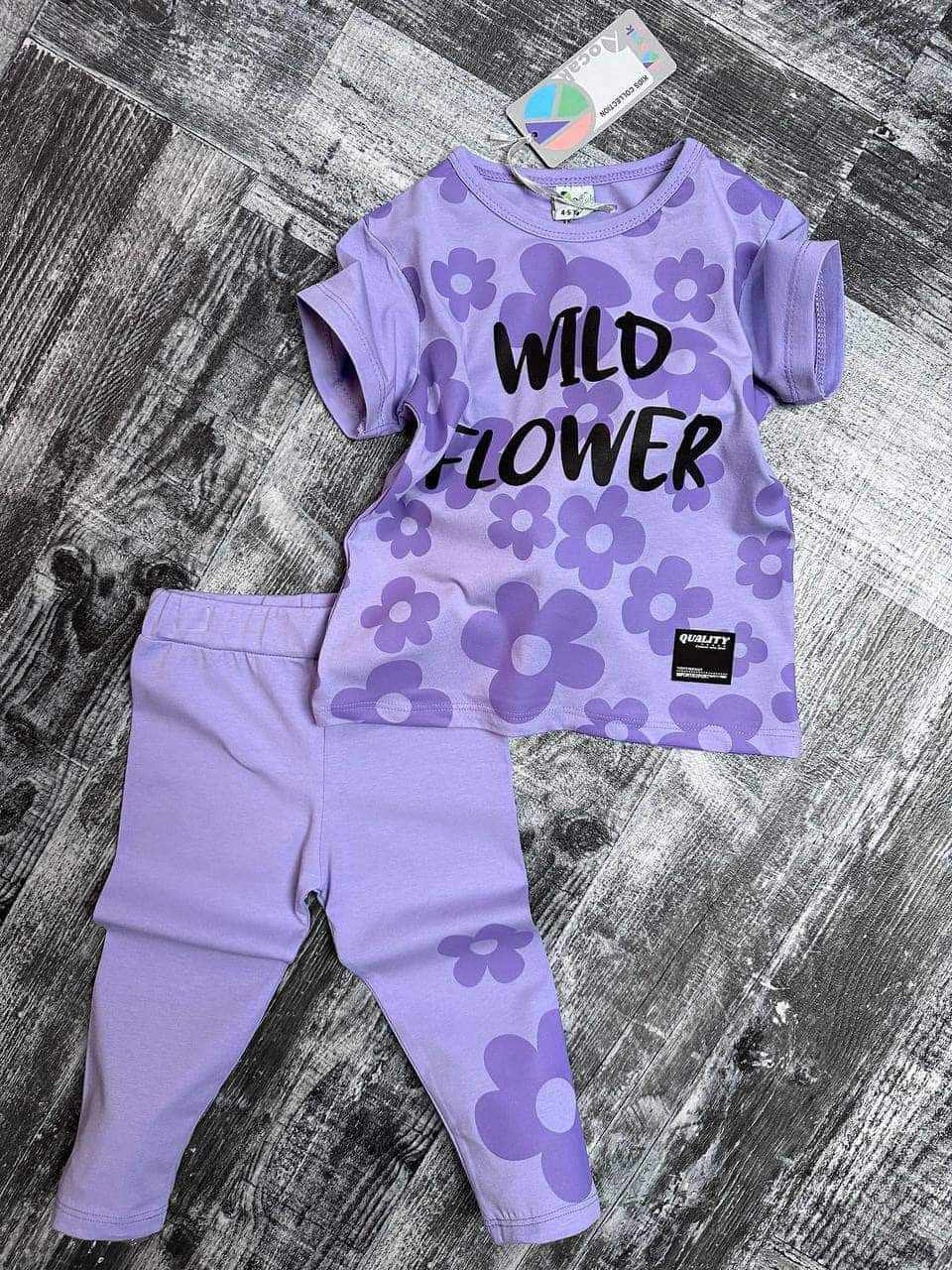 Piękny dziewczęcy komplet idealny do przedszkola/szkoły. W skłąd zestawu wchodzi fioletowa bluzka z krótkim rękawem. Jest to klasyczny model z okrągłym dekoltem. Dziewczęcego uroku dodaje jej nadruk kwiatków. Fioletowe legginsy 3/4  idealnie komponują się z bluzeczką i posiadają praktyczną gumkę w pasie. Dziewczęcy, bardzo wygodny zestaw, nie krępujący ruchów dziecka.
