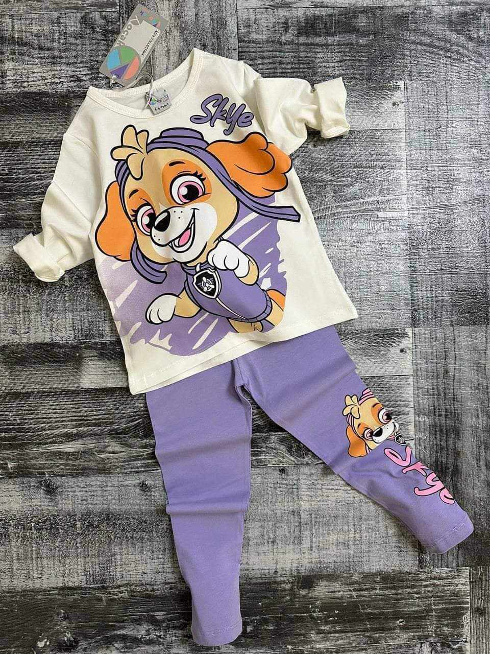 Piękny dziewczęcy komplet idealny do przedszkola/szkoły dla fanek bajki Psi Patrol. W skłąd zestawu wchodzi śmietankowa bluzka z długim rękawem. Jest to klasyczny model z okrągłym dekoltem. Dziewczęcego uroku dodaje jej nadruk Skye. Fioletowe legginsy idealnie komponują się z bluzeczką i posiadają praktyczną gumkę w pasie. Dziewczęcy, bardzo wygodny zestaw, nie krępujący ruchów dziecka.