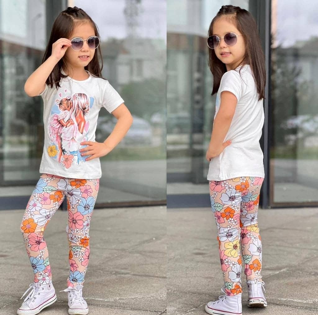 Piękny dziewczęcy komplet dla małej damy. Biała bluzka z nadrukiem mamy i córki. Jest to klasyczny model z okrągłym dekoltem. Legginsy w kwiatki imitujące prążek posiadają praktyczną gumkę w pasie. Dziewczęcy, bardzo wygodny zestaw, nie krępujący ruchów dziecka.