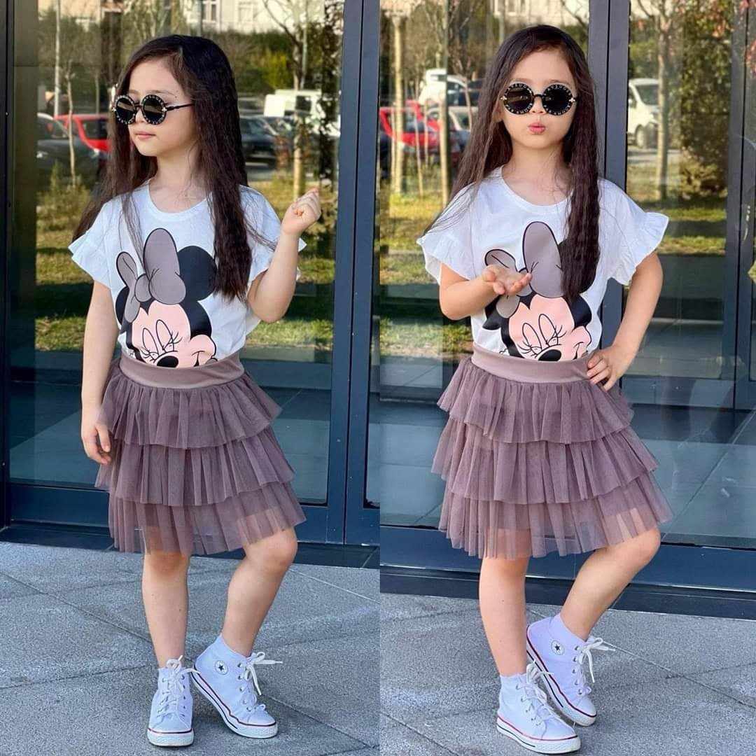 Efektowny dziewczęcy komplet na czadowe stylówki i wyróżnienie z tłumu. W zestawie biała bluzka na krótki rękaw z nadrukiem Myszki Minnie. Zakończenia falbankami przy rękawkach dodają lekkości i podkreślają dziewczęcy styl. Prześliczna brązowa spódniczka z tiulem na zewnątrz (tiul dłuższy o ok. 3 cm.) Posiada gumę w pasie, aby spódniczka utrzymywałą się na swoim miejscu. Ten komplet spodoba się każdej dziewczynce!