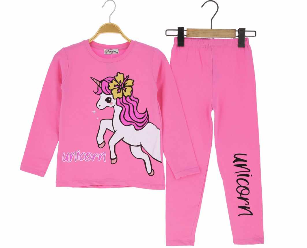 Dziewczęcy komplet dla fanek jednorożca w kolorze różowym. Bluzka z długim rękawe ma klasyczny krój i wkładana jest przez głowę. Legginsy posiadają praktyczną gumkę w pasie. Uroku całemu kompletowi nadają nadruki Unicorn na bluzce i na legginsach. To model uszyty z przyjemnej, miękkiej bawełny, nie krępującej ruchów dziecka.