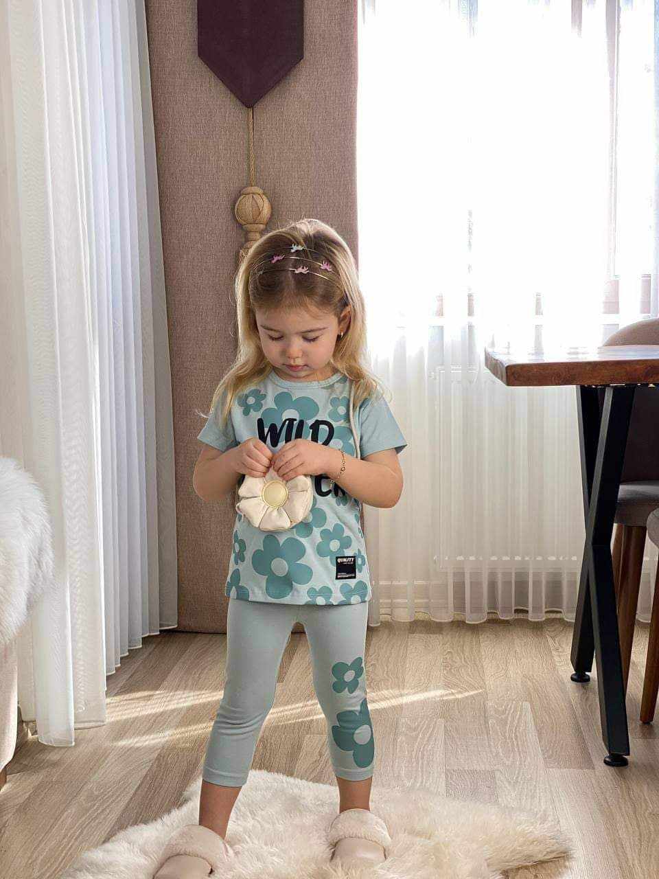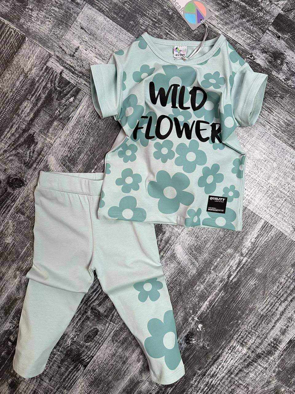 Piękny dziewczęcy komplet idealny do przedszkola/szkoły. W skłąd zestawu wchodzi zielona/seledynowa bluzka z krótkim rękawem. Jest to klasyczny model z okrągłym dekoltem. Dziewczęcego uroku dodaje jej nadruk kwiatków. Kolarki/ legginsy 3/4 idealnie komponują się z bluzeczką i posiadają praktyczną gumkę w pasie. Dziewczęcy, bardzo wygodny zestaw, nie krępujący ruchów dziecka.