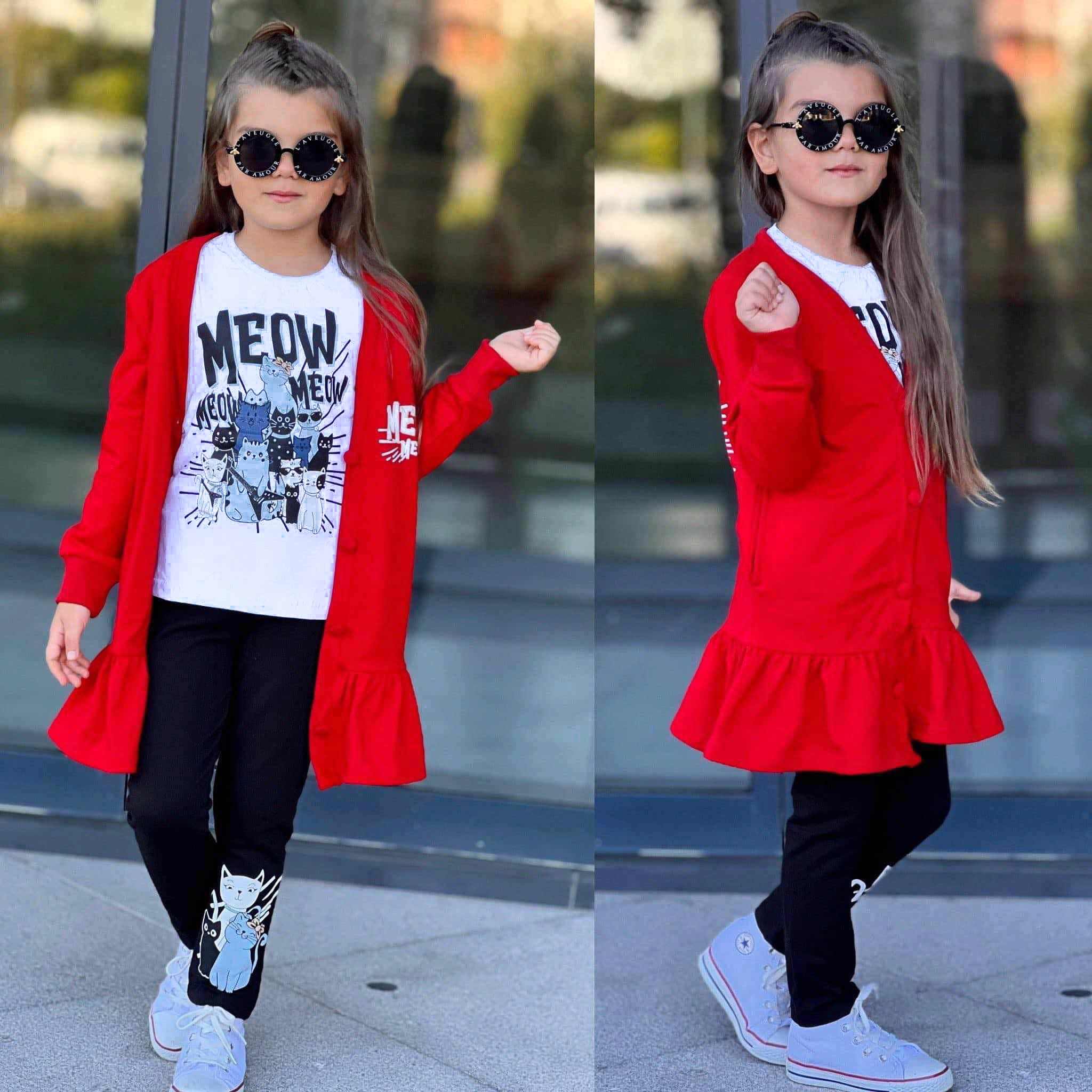 Efektowny dziewczęcy komplet na czadowe stylówki i wyróżnienie z tłumu. W zestawie biała bluzka na długi rękaw z nadrukiem kotów. Bluza o przedłużonym kroju, zapinana na owlekane materiałem guziki, z falbanką na dole. Po bokach posiada dwie, wpuszczane kieszonki, w rękawach ściągacz. Posiada dekolt w serek, a na przodzie i na plecach ozdobne nadruki. Czarne, ocieplane legginsy posiadają praktyczną gumkę w pasie. Idealnie komponują się z bluzką i kardiganem dzięki nadrukowi kotków. To model uszyty z przyjemnej, miękkiej dzianiny dresowej, nie krępującej ruchów dziecka.