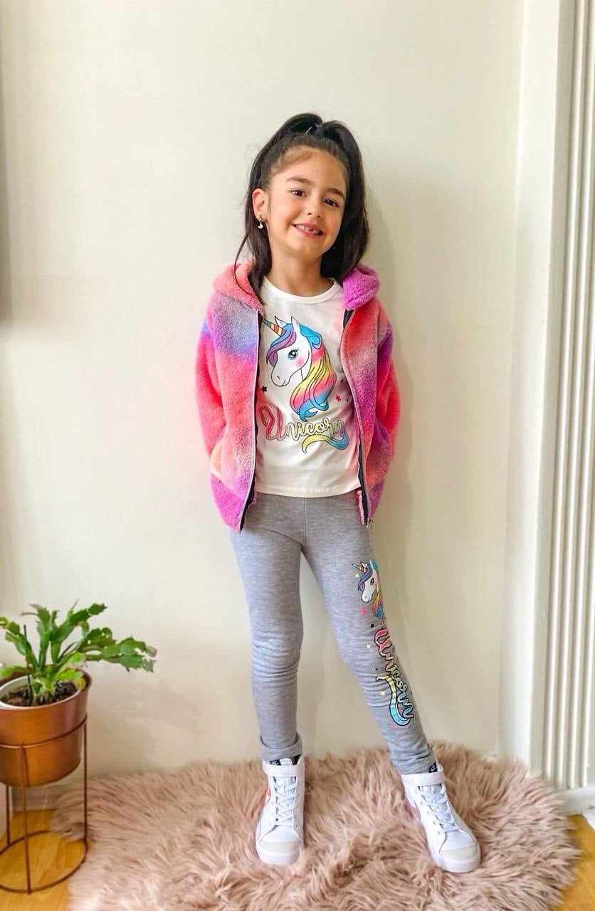 Efektowny dziewczęcy komplet na czadowe stylówki i wyróżnienie z tłumu. W zestawie śmietankowa bluzka na długi rękaw z nadrukiem Unicorn. Tęczowa bluza z kapturem zapinana na zamek i wykończona ściągaczami na dole i przy rękawkach. Wykonana z milutkiego, miękkiego materiału - typu baranek. Idealnie sprawdzi się jako kurteczka na chłodniejsze dni. Szare ocieplane legginsy posiadają praktyczną gumkę w pasie. Uroku kompletowi dodają nadruki Unicorn, a brokat podkreśla dziewczęcy styl. To model uszyty z przyjemnej, miękkiej dzianiny dresowej, nie krępującej ruchów dziecka.