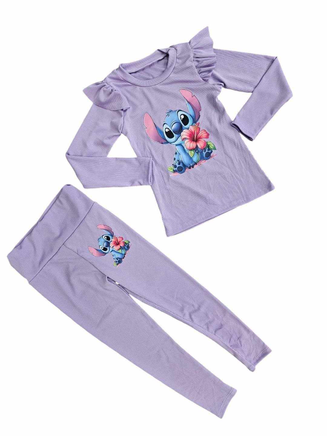 Efektowny dziewczęcy komplet: bluzka+legginsy dla fanek bajki Stitch. Fioletowa bluzka z długim rękawem ma klasyczny krój z okrągłym dekoltem. Oryginalności dodaje jej nadruk głównego bohatera. Falbanki przy ramionach dodają lekkości i podkreślają dziewczęcy styl. Legginsy  idealnie komponują się z bluzką i posiadają praktyczną gumkę w pasie. To model uszyty z materiału typu prążek. Zachwyci każde oko!