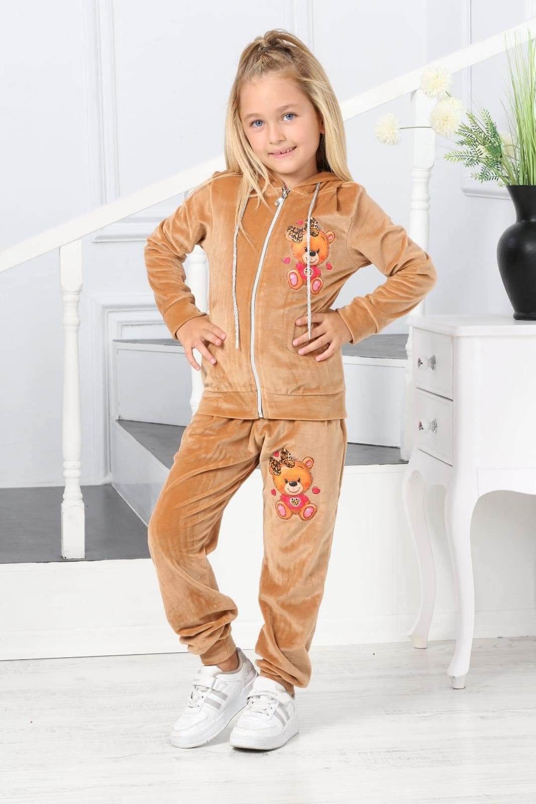 Prześliczny dres dla dziewczynki z motywem misia w kolorze karmelowym. Bluza z kapturem zapinana na zamek. Posiada ściągacze przy rękawkach i na dole bluzy. Spodnie posiadają 2 kieszonki z przodu, gumkę w pasie i ściągacze przy nogawkach. Dres jest miły w dotyku i stanowi doskonałe połączenie komfortu i stylu. Wyjątkowo modny i wygodny strój. Przypadnie do gustu każdej dziewczynce.