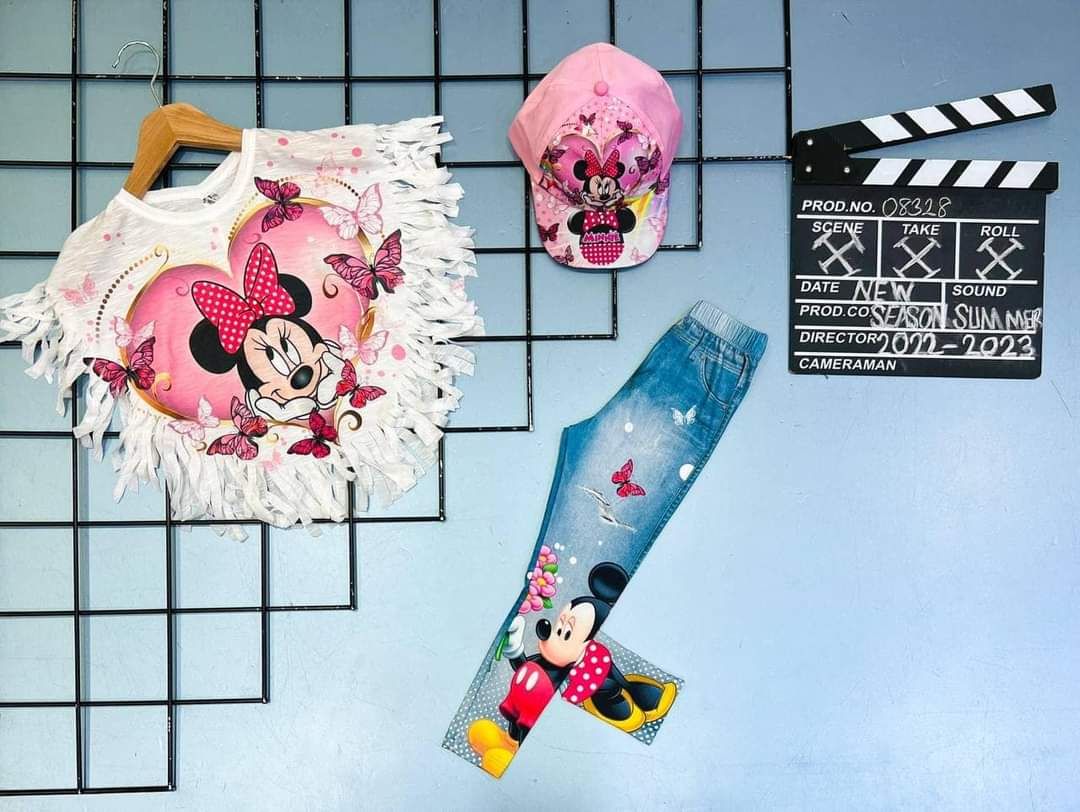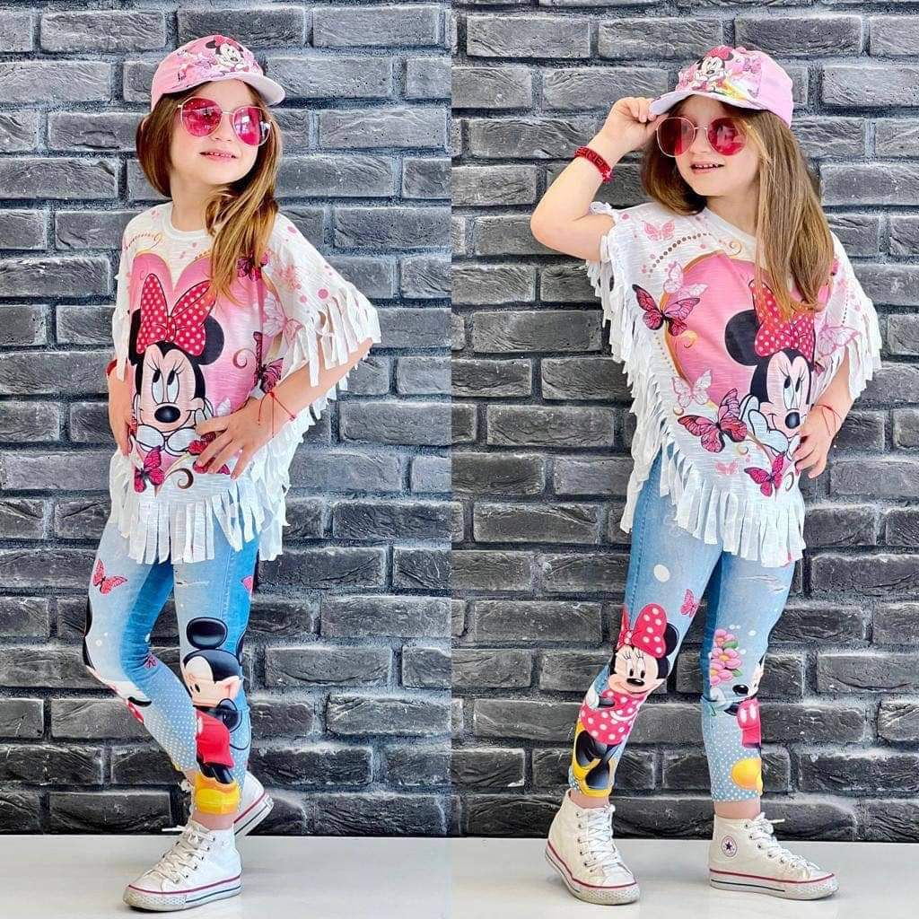 Śliczny, cienki komplecik dla fanek Myszki Minnie. Biała bluzka z krótkim rękawem typu ponczo posiada urocze frędzelki/paseczki na dole. Legginsy imitujące jeans wykonane są z elastycznego materiału, świetnie przylegają do ciała. Całość zestawu dopełnia różowa czapka z daszkiem.