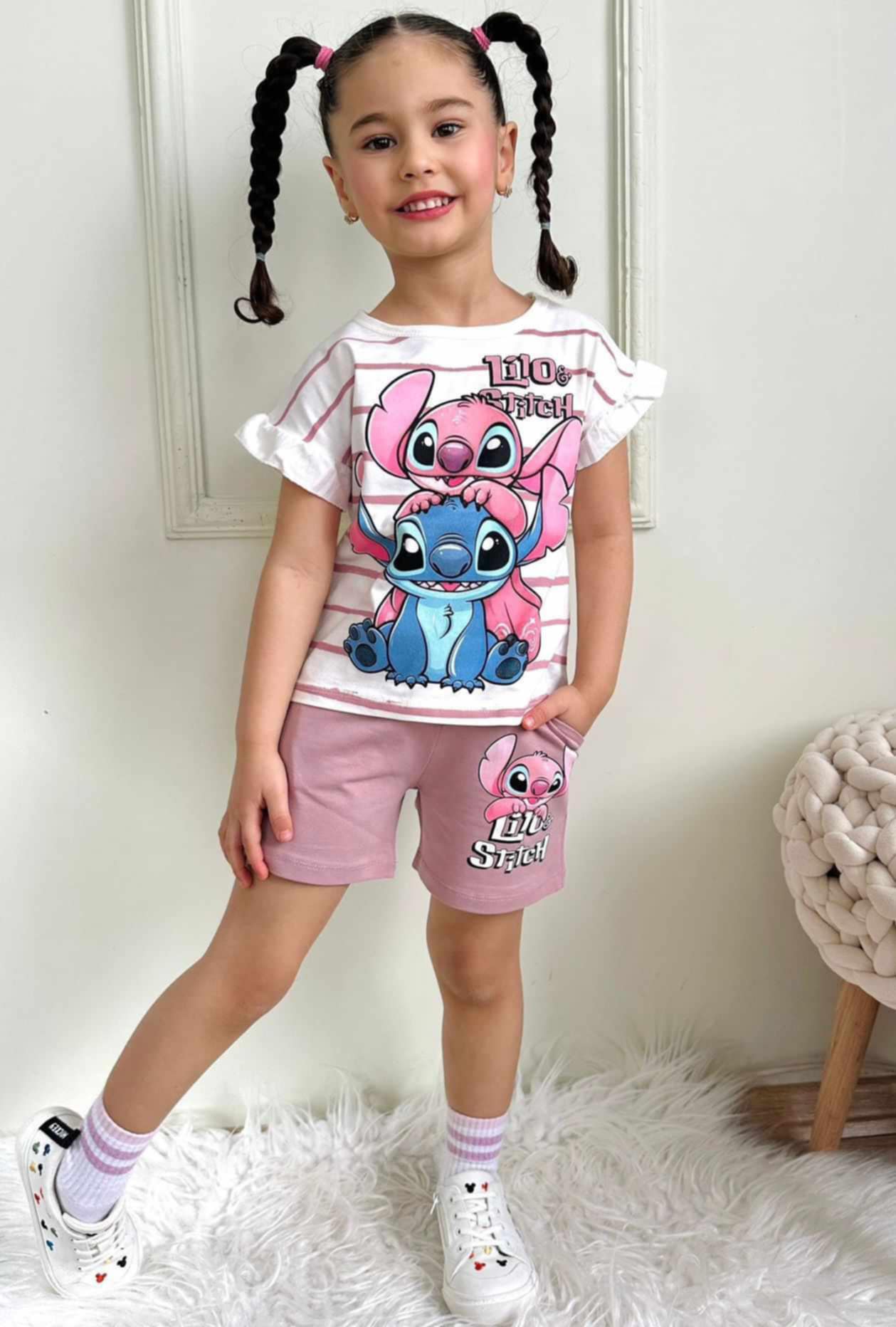 Efektowny dziewczęcy komplet: t-shirt+ krótkie spodenki dla fanek bajki Stitch. Śmietankowa bluzka z krótkim rękawem ma klasyczny krój z okrągłym dekoltem. Oryginalności dodaje jej nadruk głównych bohaterów. Falbanki przy ramionach dodają lekkości i podkreślają dziewczęcy styl. Krótkie spodenki idealnie komponują się z bluzką. Posiadają kieszenie, praktyczną gumkę w pasie i sznurek do regulacji. To model uszyty z przyjemnej, miękkiej bawełny, nie krępującej ruchów dziecka.