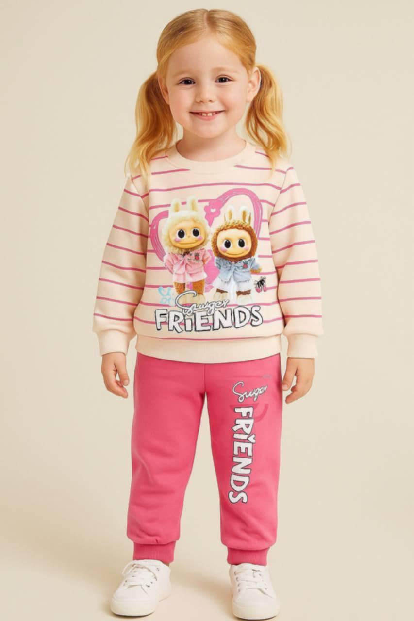Efektowny dziewczęcy komplet: bluza+spodnie. W zestawie kremowa bluza z nadrukiem Labubu. Bluza ma klasyczny krój i wkładana jest przez głowę. Posiada ściągacz na dole i przy rękawkach. Różowe spodnie posiadają nogawki ze ściągaczami, pas w gumkę i nadruk, który idealnie komponuje się z bluzą. To model uszyty z przyjemnej, miękkiej bawełny, nie krępującej ruchów dziecka.