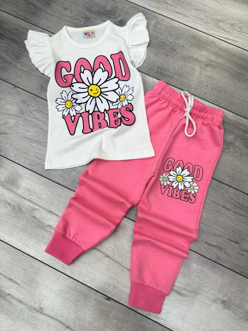 Efektowny dziewczęcy komplet: t-shirt+spodnie. Biała/śmietankowa bluzka z krótkim rękawem ma klasyczny krój z okrągłym dekoltem. Oryginalności dodaje jej nadruk GOOD VIBES. Falbanki przy ramionach dodają lekkości i podkreślają dziewczęcy styl. Różowe spodnie posiadają nogawki ze ściągaczami, szeroki pas w gumkę i nadruk taki sam, jak na bluzeczce. To model uszyty z przyjemnej, miękkiej bawełny, nie krępującej ruchów dziecka.