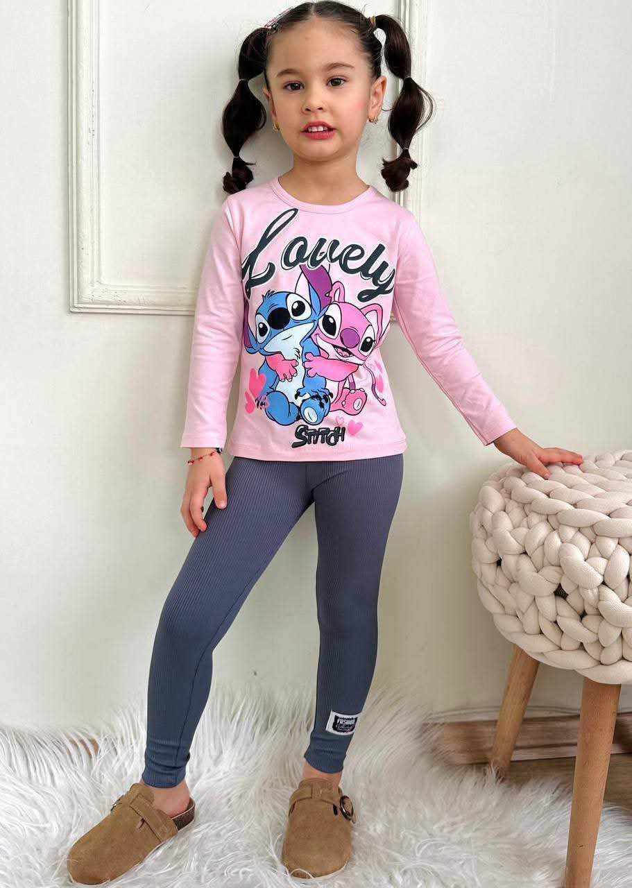 Piękny dziewczęcy komplet idealny do przedszkola/szkoły dla fanek bajki Stitch. W skłąd zestawu wchodzi różowa bluzka z długim rękawem. Jest to klasyczny model z okrągłym dekoltem. Dziewczęcego uroku dodaje jej nadruk głównych bohaterów. Grafitowe legginsy idealnie komponują się z bluzeczką. Legginsy mają strukturę prążka i posiadają praktyczną gumkę w pasie. Dziewczęcy, bardzo wygodny zestaw, nie krępujący ruchów dziecka.