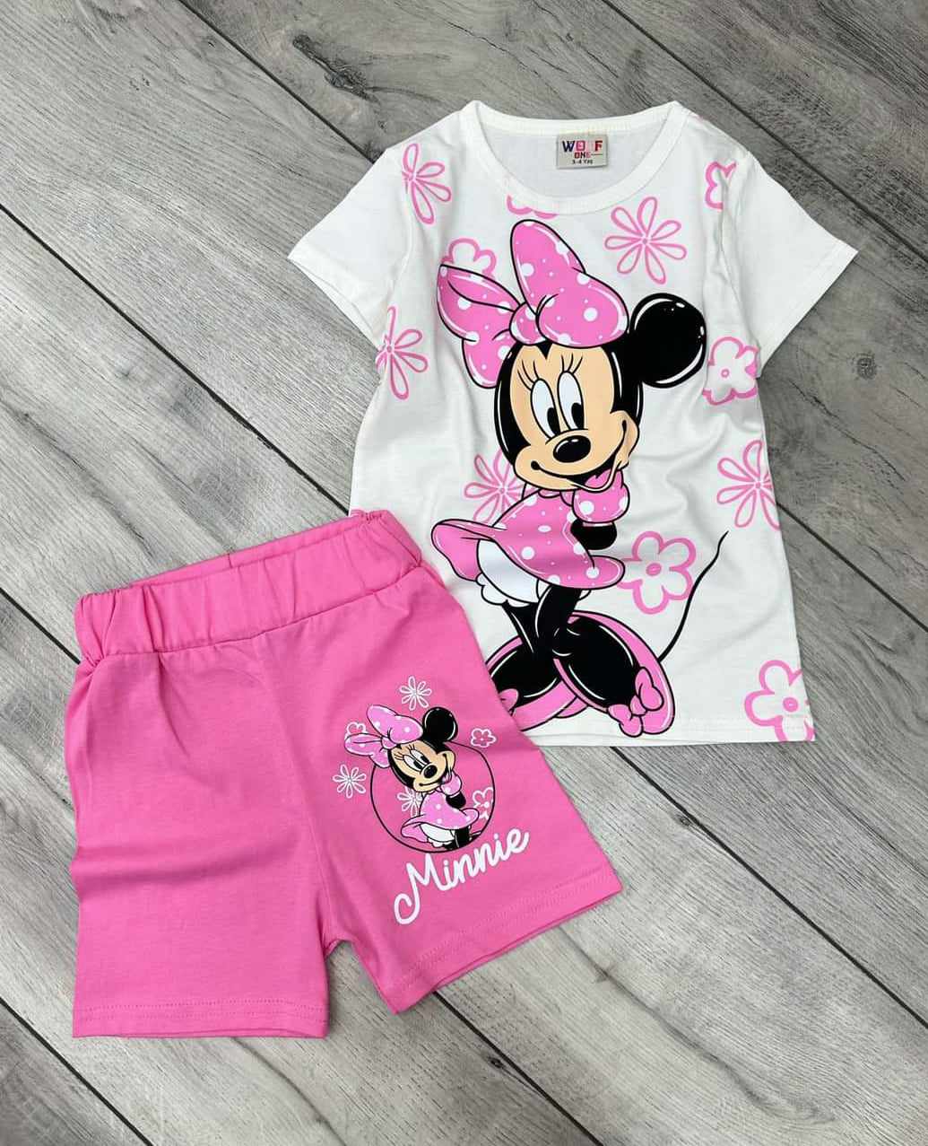 Piękny komplet 2-częściowy dla dziewczynki. Biały/śmietankowy t-shirt ma klasyczny krój z okrągłym dekoltem. Uroku bluzeczce dodaje nadruk przeuroczej Myszki Minnie. Krótkie spodenki mają pas w gumkę i są w pięknym różowym kolorze. Na lewej nogawce posiadają nadruk Minnie, taki jak na bluzce. To model uszyty z przyjemnej bawełny, nie krępującej ruchów dziecka.