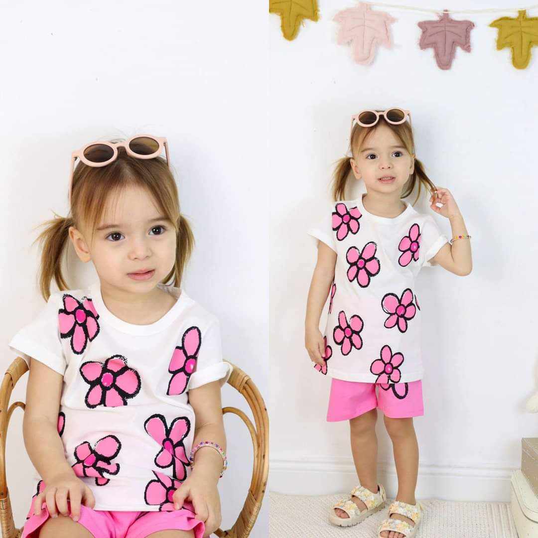Piękny komplet 2-częściowy dla dziewczynki. Biały/śmietankowy t-shirt ma klasyczny krój z okrągłym dekoltem. Uroku bluzeczce dodają nadruki kwiatków. Krótkie spodenki mają pas w gumkę i są w pięknym różowym kolorze kolorze. Na lewej nogawce posiadają nadruk kwiatka, taki jak na bluzce. To model uszyty z przyjemnej bawełny, nie krępującej ruchów dziecka.
