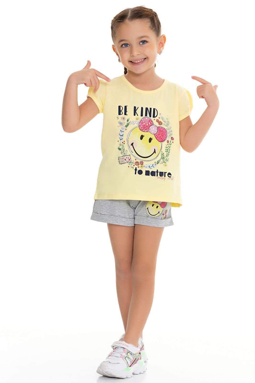 Komplet 2-częściowy dla dziewczynki. Żółty t-shirt posiada delikatne bufki przy rękawach. Tył bluzki delikatnie dłuższy o około 2 cm. Uroku bluzeczce dodaje nadruk uśmiechniętej buźki z połyskującymi cekinami. Krótkie spodenki mają pas w gumkę i są koloru szarego. Posiadają dwie kieszenie i nadruk -taki sam jak na bluzeczce. Uroku szortom dodaje kokardka na środku. To model uszyty z przyjemnej bawełny, nie krępującej ruchów dziecka.