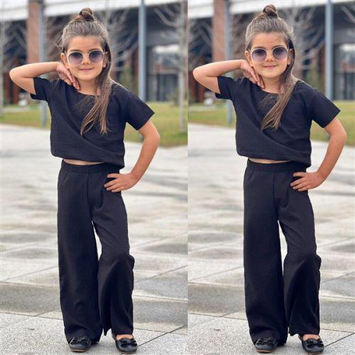 Prześliczny, cienki komplet dziewczęcy składający się z bluzki oraz spodni. Bluzka z krótkim rękawem została zaprojektowana w kolorze czarnym. Bluzka wykończona gumką na dole. Spodnie o luźniejszym fasonie z szerokimi nogawkami. Dzwony/szwedy posiadają elastyczną gumę, aby spodenki utrzymywały się na swoim miejscu. Komplet stanowi oryginalną stylizacją na różne okazje.
