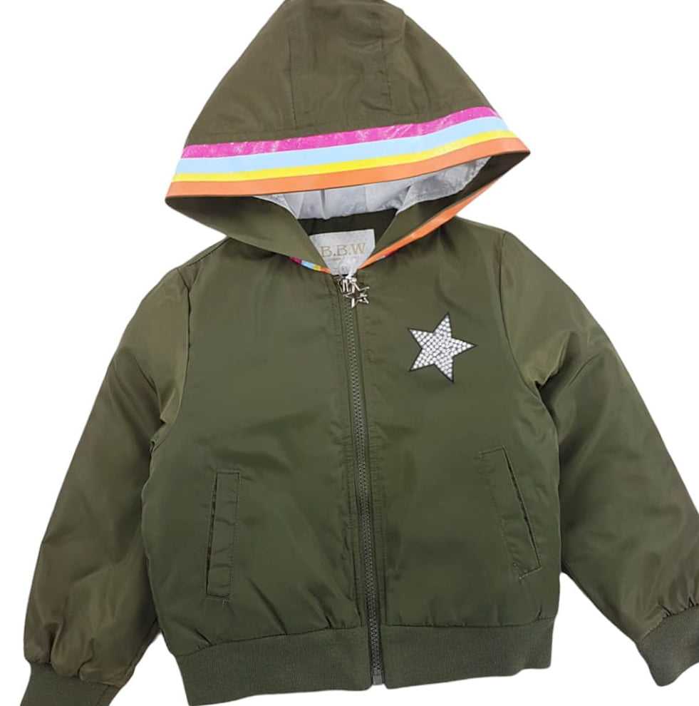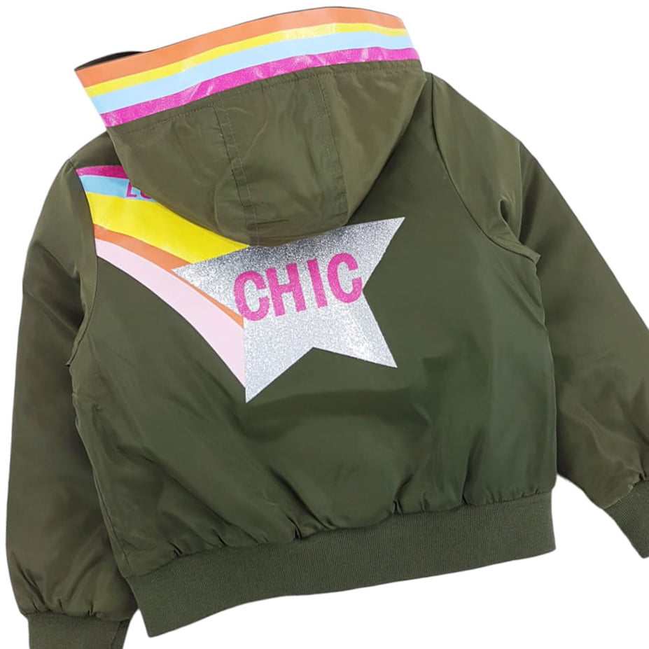 Stylowa kurtka dziewczęca z kapturem w kolorze różowym. Kurtka jest wykonana z tkaniny impregnowanej. Kurtka delikatnie ocieplana włókniną puszystą. Kurteczka zapinana na zamek błyskawiczny. Na dole kurtki i przy rękawach ściągacze, które świetnie chronią przed dostaniem się wiatru. W kurtce są dwie kieszenie boczne do przechowywania skarbów lub ogrzania rąk. Uroku kurteczce dodają ozdobne, kolorowe, brokatowe nadruki: srebrna gwiazdka z przodu, kolorowy lampas wokół kaptura, i duży kolorowy nadruk z tyłu. Wygląda niesamowicie stylowo, wyróżnia ją modna kolorystyka i oryginalne wzornictwo.