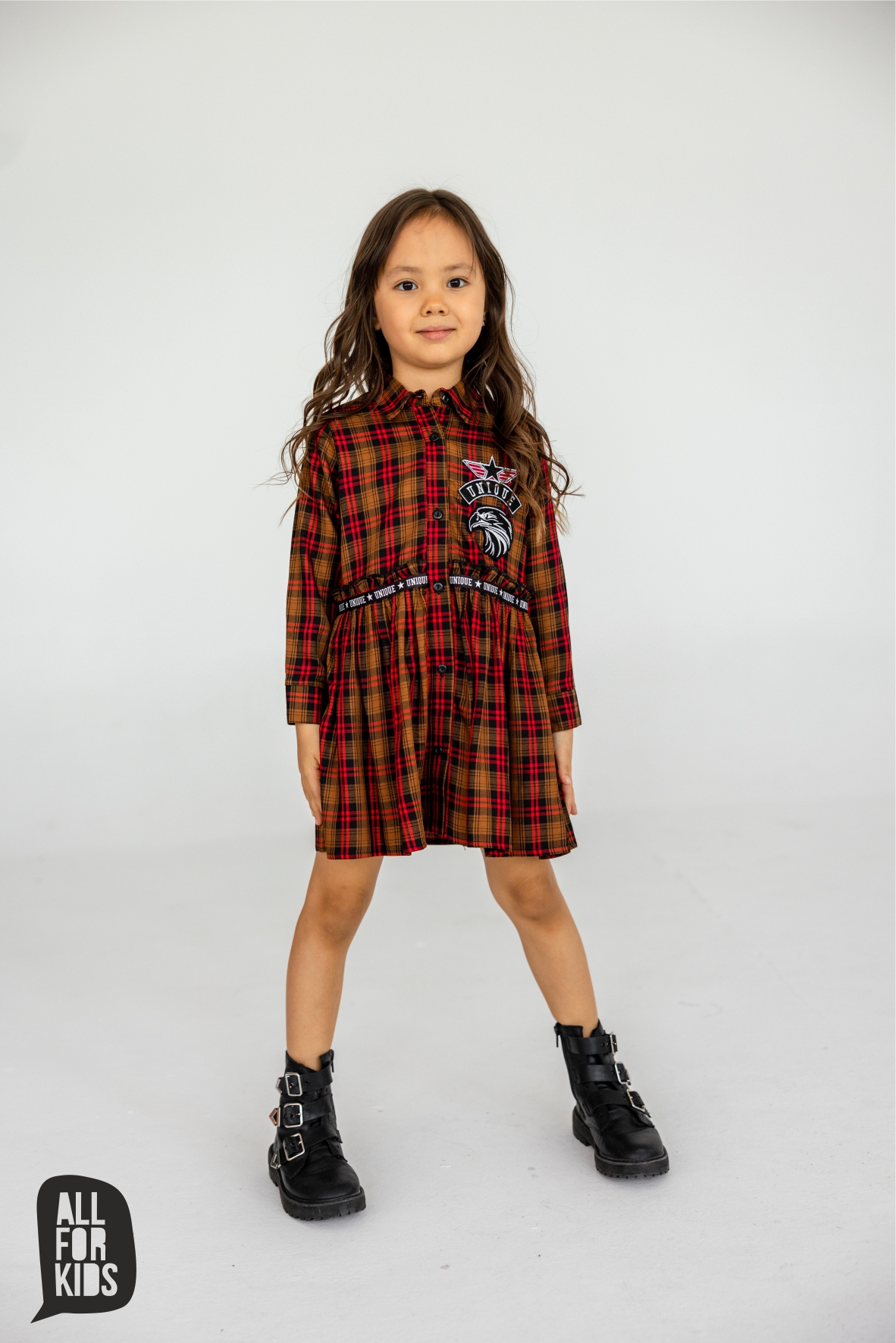 Zjawiskowa, nietuzinkowa sukienka w kratę uszyta w Polsce przez markę All For Kids. Sukienka z długim rękawem i kołnierzykiem. Zapinana na guziki, odcinana w pasie. Sukienka wykonana z wysokiej jakości miękkiego i miłego w dotyku materiału, dzięki czemu jest komfortowa w noszeniu. Kolekcje producenta All for kids szyte są w krótkich seriach, co zapewnia im wyjątkowość i niepowtarzalność. Najwyższa jakość Premium!