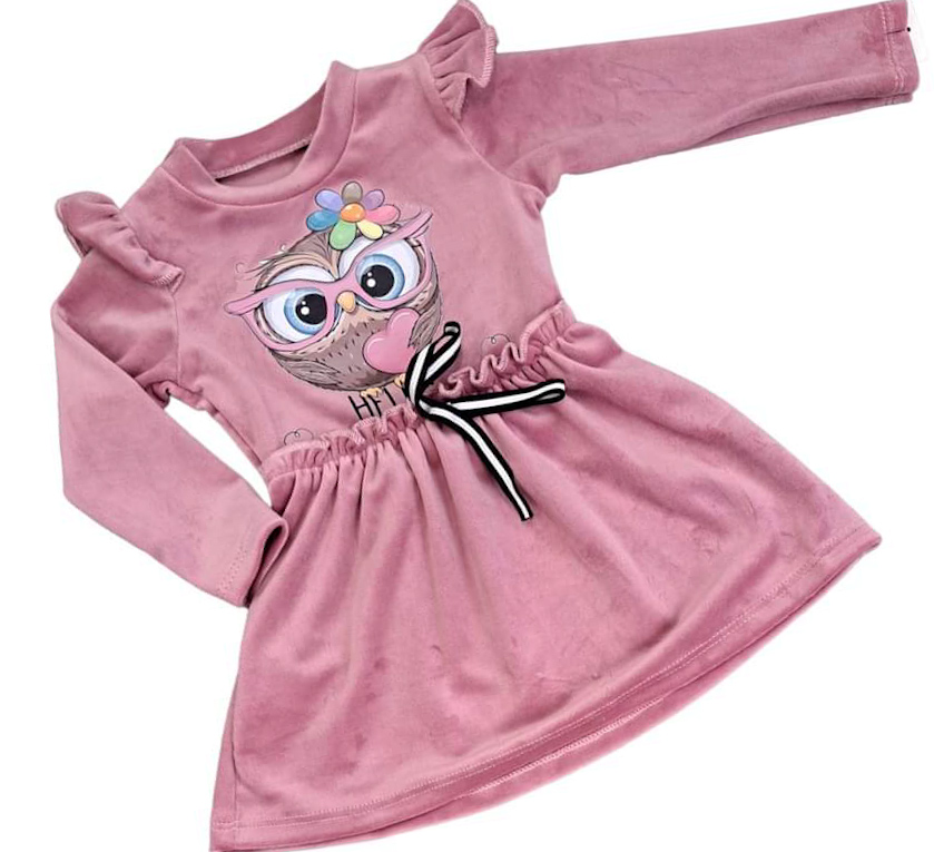 Przepiękna różowa sukienka z długim rękawem od włoskiego producenta New Collection. Sukienka z weluru jest odcinana w pasie. Posiada ozdobne sznureczki. Na przodzie znajduje się duży nadruk sowy. Falbanki przy rękawkach dodają sukience dziewczęcego uroku. To model uszyty z przyjemnego, miękkiego materiału, nie krępującego ruchów dziecka.