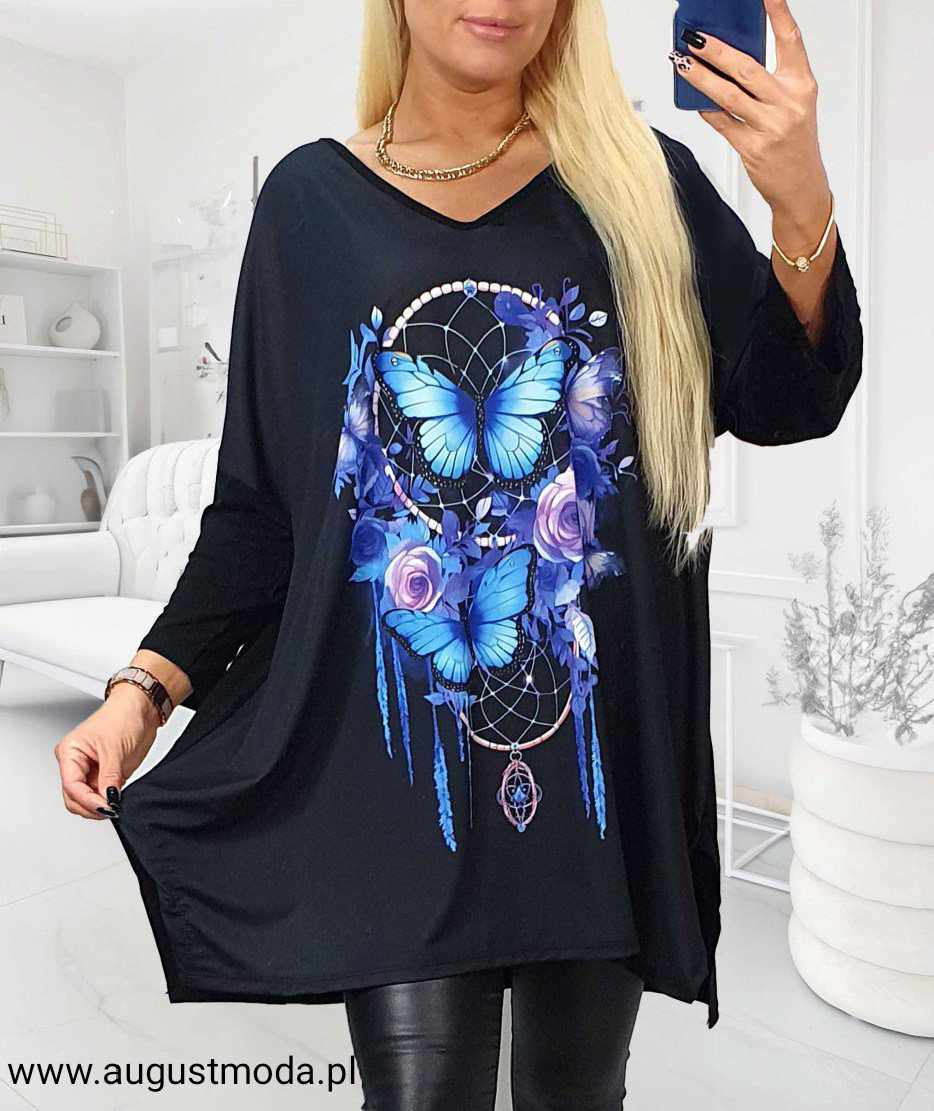 Piękna bluzka/tunika Plus Size w kolorze czarnym. Bluzka z dekoltem w serek i z rękawem 7/8 (w zależności od wzrostu). Oryginalności dodaje jej cyfrowy nadruk- zapewnia intensywne, głębokie kolory. Uszyta ze świetnej jakości, elastycznego materiału. Luźny, nietoperzowaty krój subtelnie układa się na każdej sylwetce. Idealna propozycja dla tych kobiet, które lubią zarówno wygodę jak i niebanalny styl. Oferowana bluzka pochodzi z kolekcji, które szyte są w krótkich seriach, co zapewnia im wyjątkowość i niepowtarzalność. Tunika występuje w jednym dużym oversizowym rozmiarze- ten model będzie odpowiednia dla Pań noszących rozmiar odzieżowy od 46 do 54 ( krój będzie swobodniejszy lub bardziej dopasowany). Obwód bluzki w klatce piersiowej wynosi około 130-140 cm.
