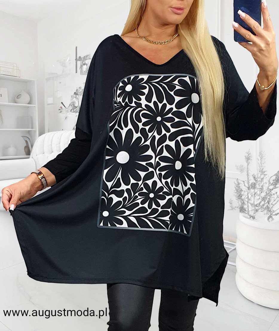 Piękna bluzka/tunika Plus Size w kolorze czarnym. Bluzka z dekoltem w serek i z rękawem 7/8 (w zależności od wzrostu). Oryginalności dodaje jej cyfrowy nadruk- zapewnia intensywne, głębokie kolory. Uszyta ze świetnej jakości, elastycznego materiału. Luźny, nietoperzowaty krój subtelnie układa się na każdej sylwetce. Idealna propozycja dla tych kobiet, które lubią zarówno wygodę jak i niebanalny styl. Oferowana bluzka pochodzi z kolekcji, które szyte są w krótkich seriach, co zapewnia im wyjątkowość i niepowtarzalność. Tunika występuje w jednym dużym oversizowym rozmiarze- ten model będzie odpowiednia dla Pań noszących rozmiar odzieżowy od 46 do 54 ( krój będzie swobodniejszy lub bardziej dopasowany). Obwód bluzki w klatce piersiowej wynosi około 130-140 cm.